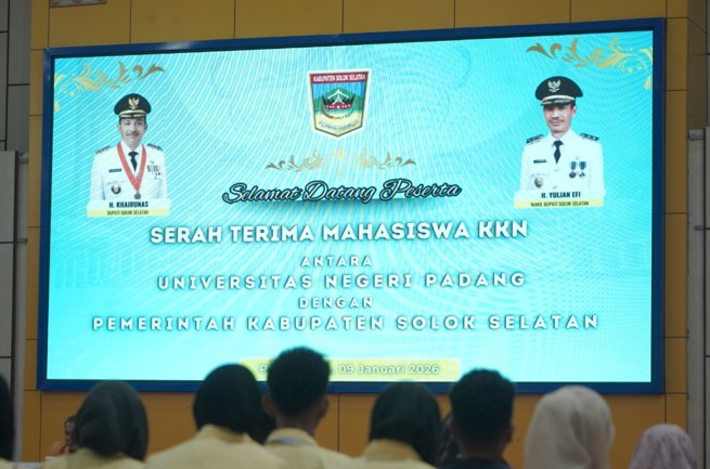 Pemerintah Kabupaten Solok Selatan secara resmi menerima mahasiswa Kuliah Kerja Nyata (KKN) dari Universitas Negeri Padang dalam kegiatan serah terima yang digelar di Kantor Bupati Solok Selatan, Jum’at (9/1/2026). Kegiatan ini menandai dimulainya pelaksanaan KKN Reguler UNP di wilayah tersebut, yang untuk pertama kalinya dilaksanakan di Kabupaten Solok Selatan.